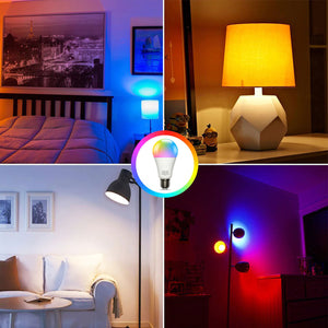 Temporizador programado y luz de despertador: Las bombillas inteligentes se encienden y apagan automáticamente en un momento dado a través de la función del temporizador. La ampolleta LED inteligente puede cambiar los colores de acuerdo con el ritmo musical y los efectos de flash para satisfacer sus necesidades para una atmósfera diferente a través de la música.